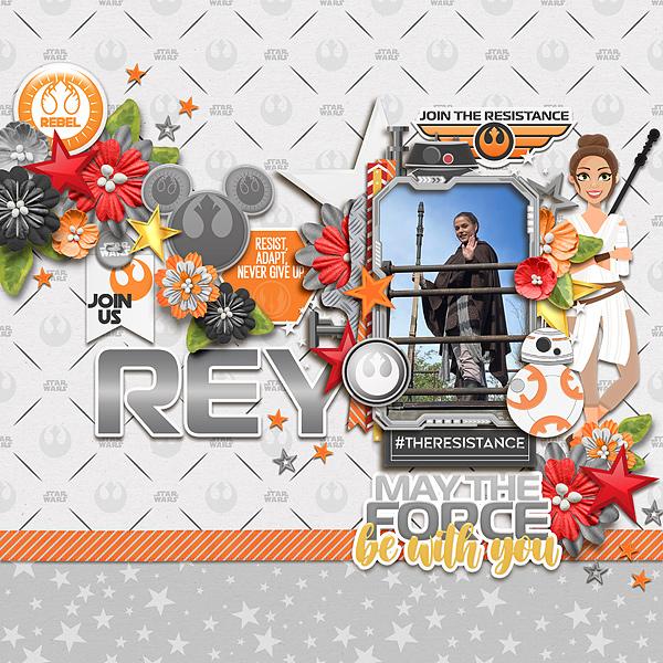 Inside this kit are 10 themed patterned and solid papers, an alpha set, plus over 50 themed elements including AT-AT, BB8, BB0, Death Star, fighter, flag, guns, light sabers, logos, Mickey ears, Mickey head, Moradi, Rey, stars, Stormtrooper, symbol, and more!